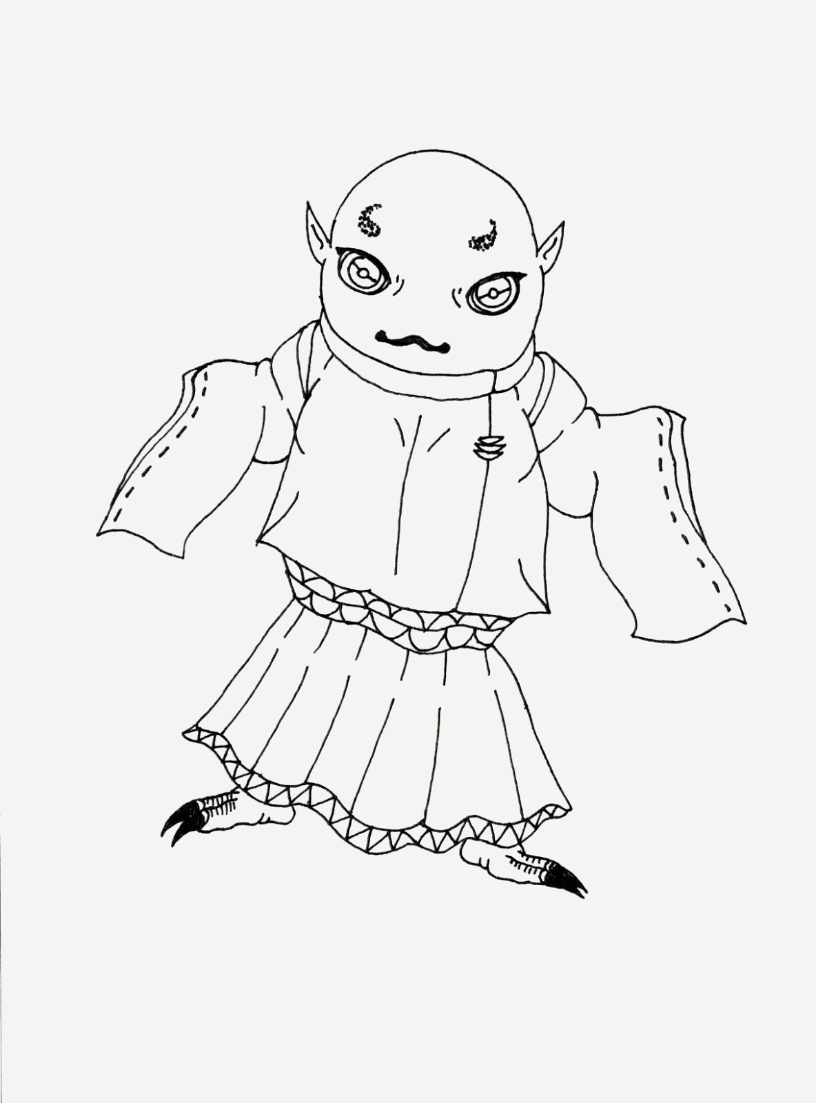 アマネサクのデザインは、坊主頭の小鬼の様な姿の妖怪に描きました。