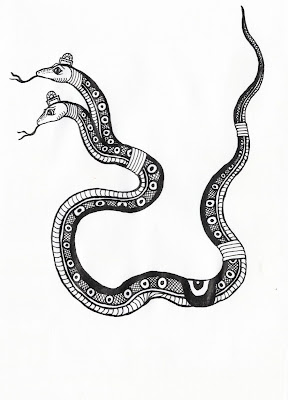 揮文のデザインは、頭が二つある蛇の姿に描きました。